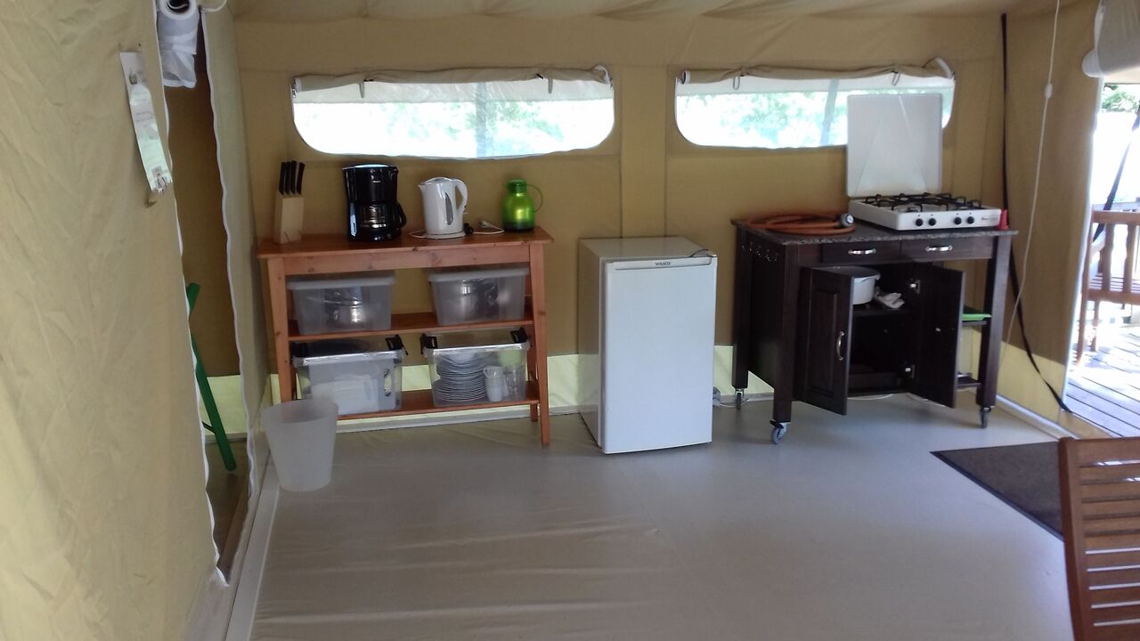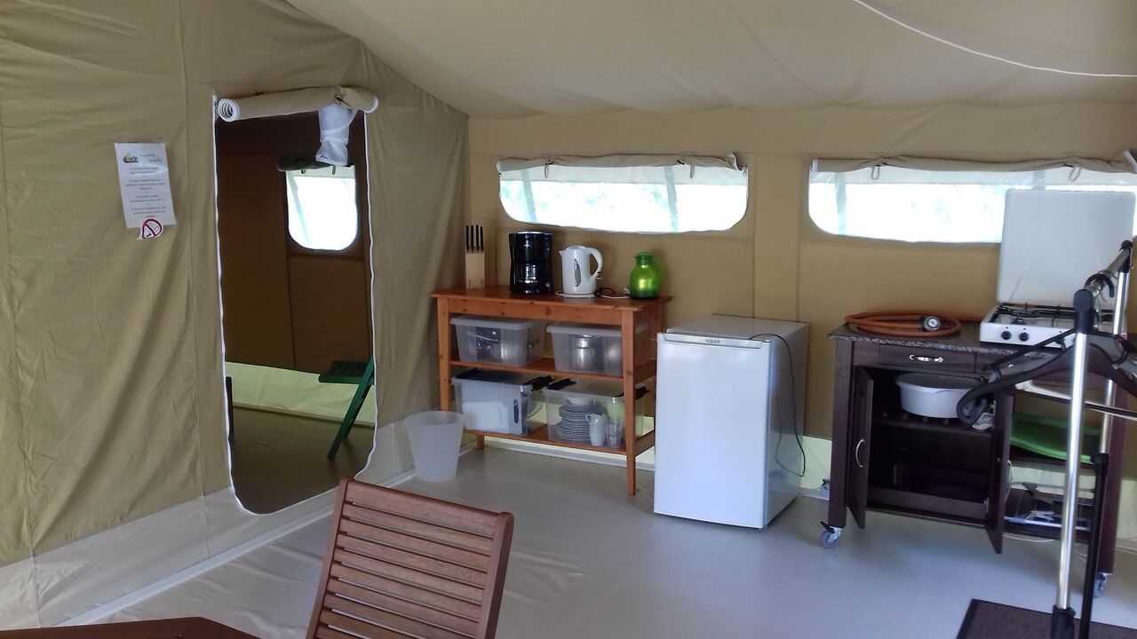 - Vores telt har 2 separate soveværelser med fast seng, dyner og pude.